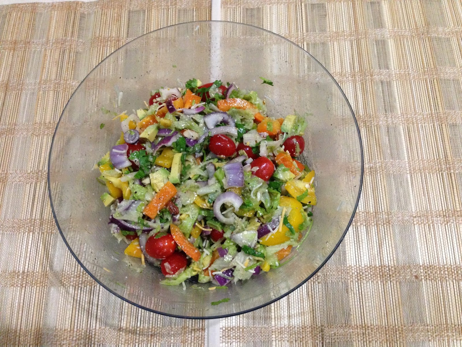 - Every time toss the salad in the bowl as you add a new ingredient. If tossing is difficult, gently mix the salad using a wide spatula.